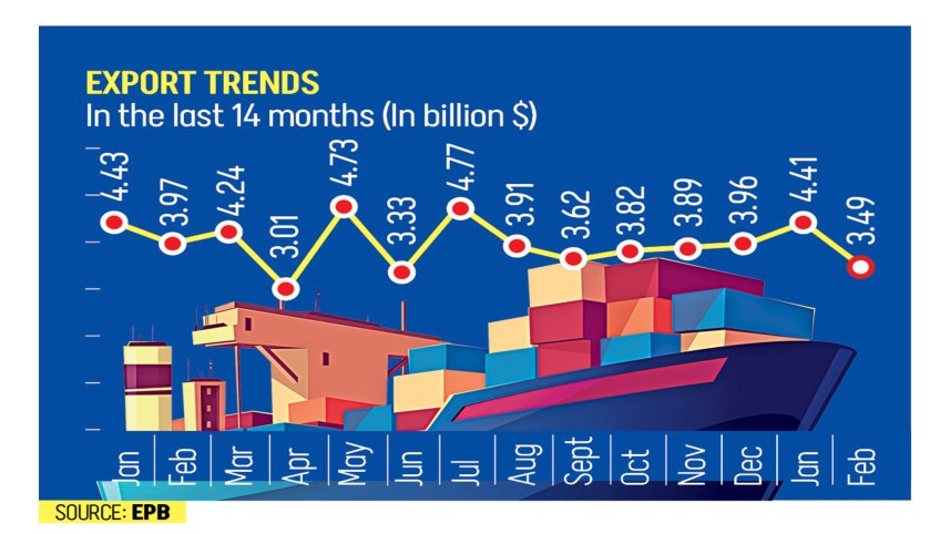 অর্থাৎ মাসওয়ারি ভিত্তিতে কমেছে ২২ দশমিক ১০ শতাংশ।উপখাতের মধ্যে নিট পোশাক রপ্তানি কমে ১৩ দশমিক ৬৮ বিলিয়ন ডলারে দাঁড়িয়েছে, যা ৪ দশমিক ৫৬ শতাংশ কম। একই সময়ে ওভেন পোশাক রপ্তানি হয়েছে ১২ দশমিক ১০ বিলিয়ন ডলার, যা কমেছে ২ দশমিক ৭৯ শতাংশ।পতনের কারণ কী?ইপিবি জানিয়েছে, সাময়িক কিছু কারণ রপ্তানিতে প্রভাব ফেলেছে। এর মধ্যে রয়েছে বন্দর কার্যক্রমে বিঘ্ন, জাতীয় নির্বাচন এবং বৈশ্বিক বাজারে চাহিদা কমে যাওয়া। কৃষিপণ্য, তুলা, পাটজাত পণ্য, নন-লেদার জুতা ও সিরামিক খাতেও প্রত্যাশিত প্রবৃদ্ধি হয়নি।