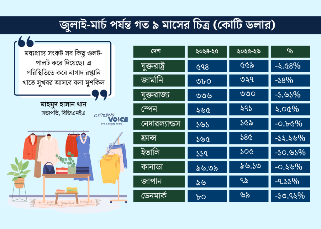 রপ্তানি উন্নয়ন ব্যুরোর (ইপিবি) হালনাগাদ পরিসংখ্যান বিশ্লেষণে দেখা গেছে, চলতি অর্থবছরের জুলাই থেকে মার্চ পর্যন্ত সময়ে শীর্ষ ১০ রপ্তানি বাজারের অধিকাংশ দেশেই আয় কমেছে। এই তালিকায় রয়েছে যুক্তরাষ্ট্র, জার্মানি, যুক্তরাজ্য, স্পেন, নেদারল্যান্ডস, ফ্রান্স, ইতালি, কানাডা, জাপান ও ডেনমার্ক।