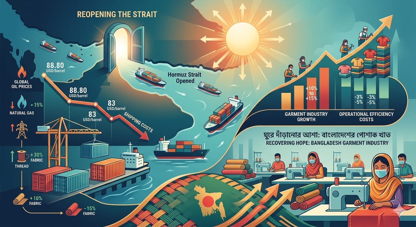 দীর্ঘ কয়েক সপ্তাহের উদ্বেগ, অনিশ্চয়তা ও ব্যয়চাপের পর অবশেষে কিছুটা স্বস্তির আলো দেখতে শুরু করেছে দেশের তৈরি পোশাক খাত। মধ্যপ্রাচ্যের উত্তেজনা প্রশমিত হওয়ার প্রেক্ষাপটে কৌশলগতভাবে গুরুত্বপূর্ণ হরমুজ প্রণালী পুনরায় উন্মুক্ত করার ঘোষণার পর বিশ্ববাজারে জ্বালানি তেলের দামে বড় ধরনের পতন ঘটেছে—যার ইতিবাচক প্রভাব ধীরে ধীরে এসে পৌঁছাচ্ছে বাংলাদেশের কারখানাগুলোতেও।