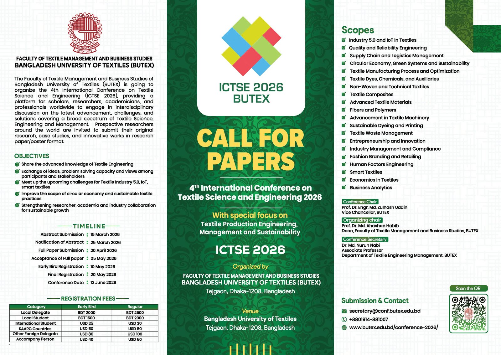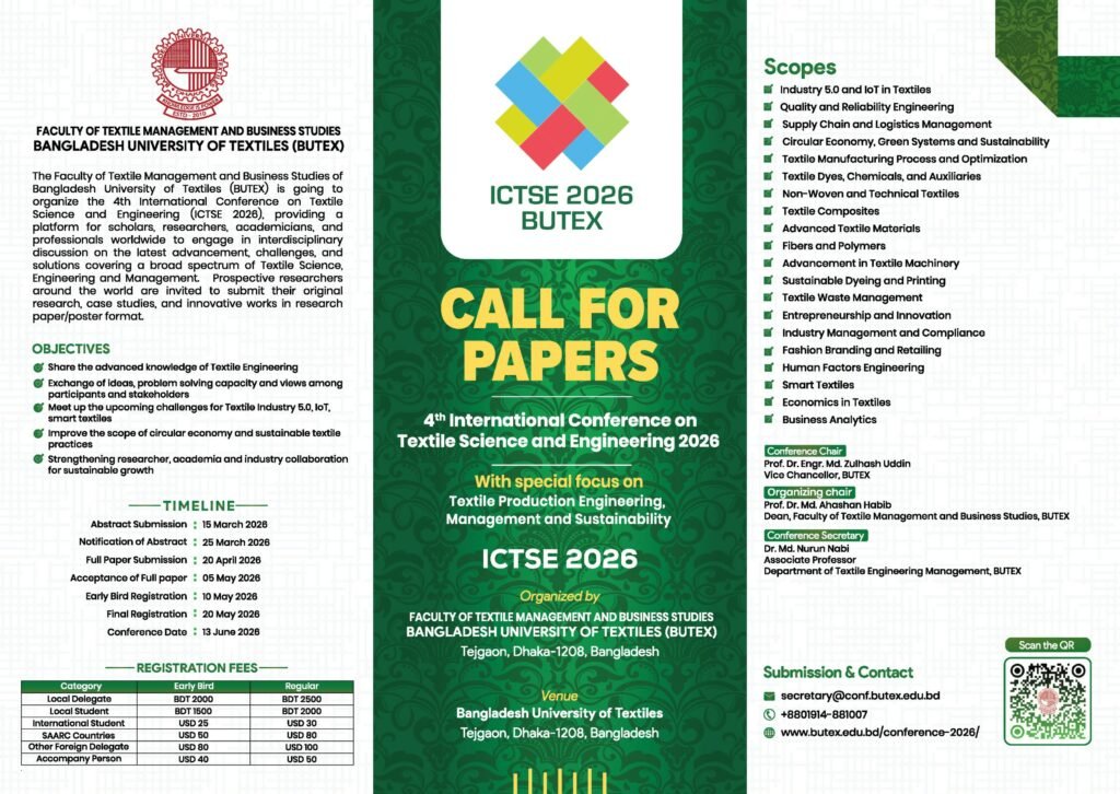 তিনি আরও বলেন, এ আন্তর্জাতিক সম্মেলন একাডেমিয়া ও শিল্পখাতের মধ্যে কার্যকর সংযোগ তৈরি করবে। পাশাপাশি সর্বাধুনিক গবেষণা, উদ্ভাবনী প্রযুক্তি ও বাস্তব অভিজ্ঞতা বিনিময়ের মাধ্যমে বাংলাদেশের টেক্সটাইল শিল্পকে আরও প্রতিযোগিতামূলক ও ভবিষ্যতমুখী করে তুলতে সহায়তা করবে। এ জন্য দেশ-বিদেশের গবেষক, স্কলার ও শিল্প পেশাজীবীদের তাদের উদ্ভাবনী গবেষণা ও প্রযুক্তিগত সমাধান জমা দেওয়ার আহ্বান জানানো হয়েছে।