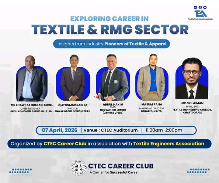 চট্টগ্রাম টেক্সটাইল ইঞ্জিনিয়ারিং কলেজ (সিটিইসি)-এ আগামীকাল ৭ এপ্রিল অনুষ্ঠিত হতে যাচ্ছে টেক্সটাইল ও আরএমজি খাতে ক্যারিয়ার গড়ার বিশেষ দিকনির্দেশনামূলক সেশন। ‘এক্সপ্লোরিং ক্যারিয়ার ইন টেক্সটাইল অ্যান্ড আরএমজি সেক্টর’ শীর্ষক এই অনুষ্ঠানের আয়োজন করেছে সিটিইসি ক্যারিয়ার ক্লাব ও টেক্সটাইল ইঞ্জিনিয়ার্স অ্যাসোসিয়েশন।